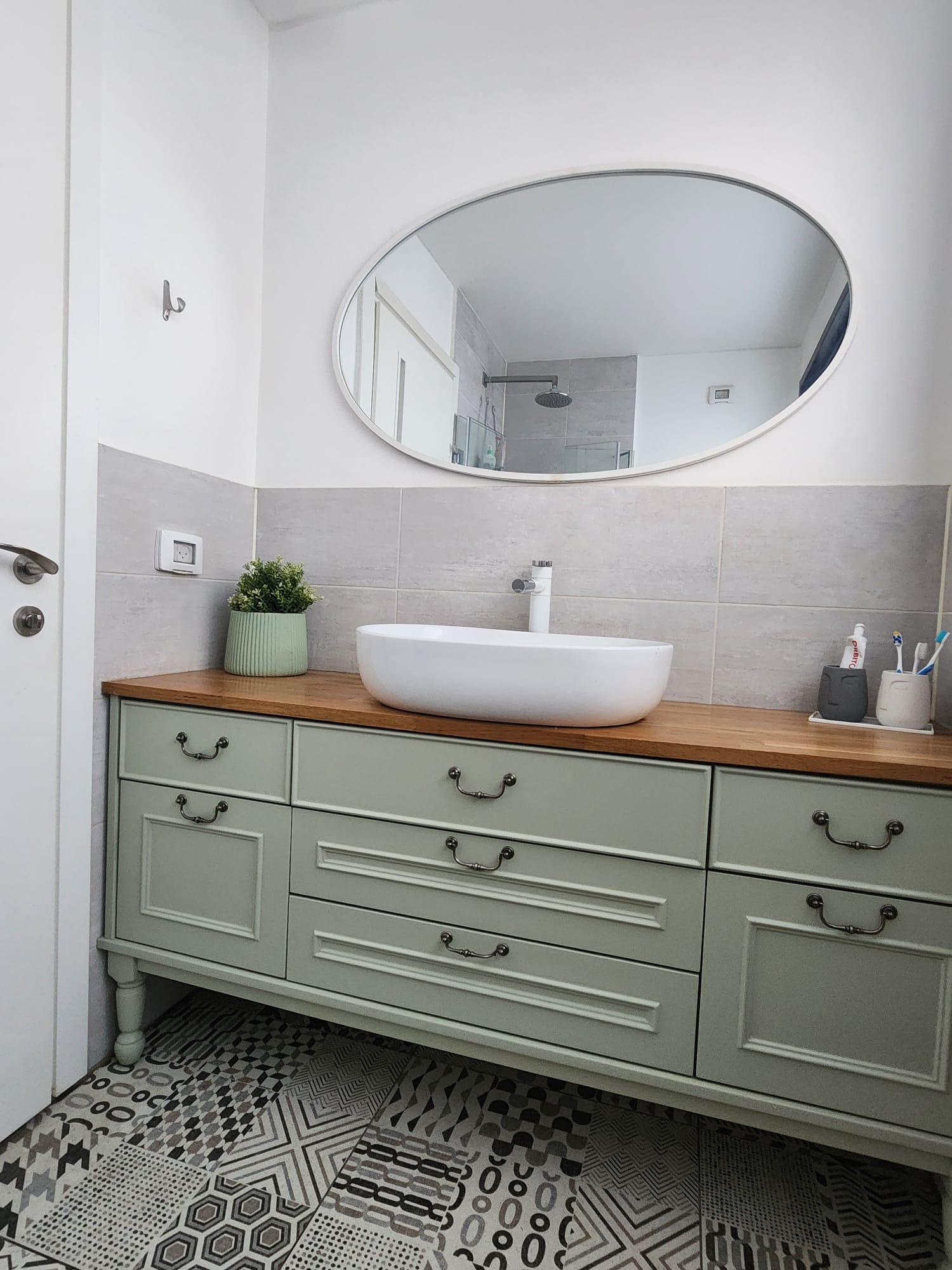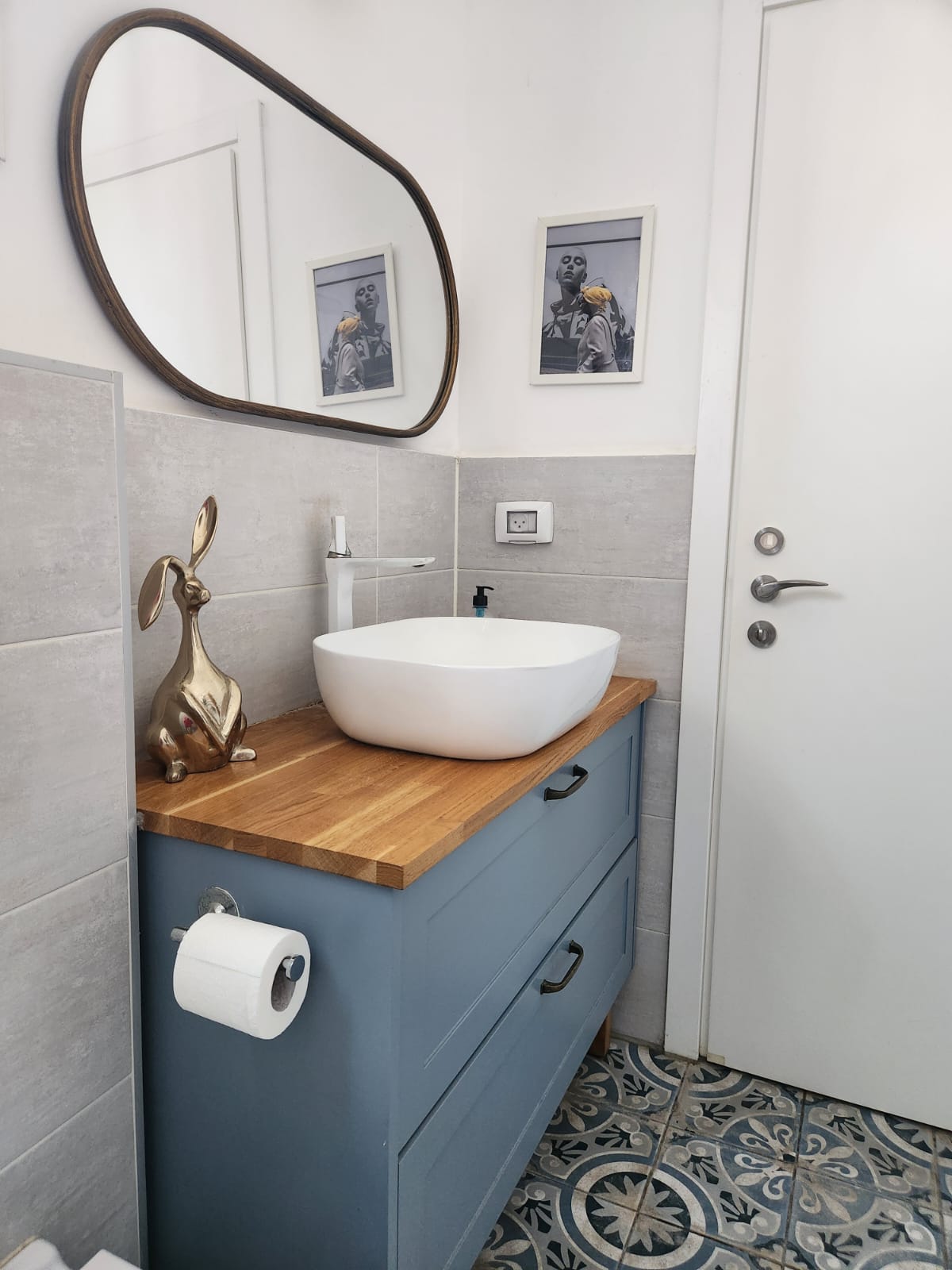 לעומת זאת, חדרי הרחצה שואבים השראה מעולם כפרי. אריחים מצויירים עם טקסטורות רכות משתלבים עם הריהוט בצבעים רכים . בכל אחד מחדרי הרחצה בחרנו צבע ארונות שמדבר בשפה אחרת. בחדר רחצה אחד צבע הארונות נגזר ישירות מהצבע של האריחים, מה שיוצר אחידות והרמוניה ברורה. בחדר השני בחרנו צבע ארונות שמשתלב בהרמוניה עם גווני האריחים, מבלי להיות זהה להם, מה שמעניק תחושת עומק ועניין ויוצר איזון עדין בין הצבעים