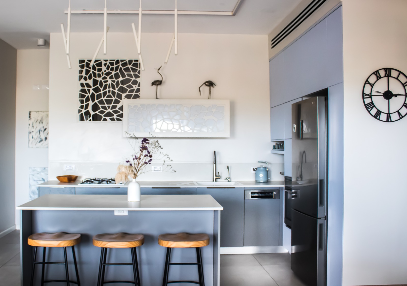 המעברים בין החללים מדויקים ומתוכננים כך שכל סגנון מקבל את המקום שלו בלי להפריע לאחר. המטבח משלב חומרים כמו עץ ומתכת, עם פתרונות אחסון נוחים ומשטחי עבודה גדולים שמתאימים לשימוש יומיומי. הצבעים בבית מתחלפים בצורה טבעית, מה שמאפשר לכל חלל לשמור על האופי הייחודי שלו. הבחירה בטקסטורות ובחומרים נעשתה תוך מחשבה על שימושיות ותחזוקה, כך שהבית קל ונעים למגורים. כל פרט בעיצוב נבחר בקפידה כדי ליצור איזון בין הפונקציונלי לאסתטי בכל חדר