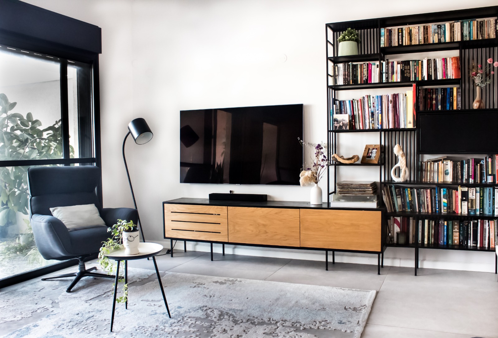 הסלון מעוצב בסגנון מודרני נקי בצבעים מאופקים, קווים ישרים, תאורה מחושבת וריהוט מינימליסטי עם נגיעות חמימות של עץ. הכל יוצר תחושת פתיחות, שקט וניקיון עיצובי